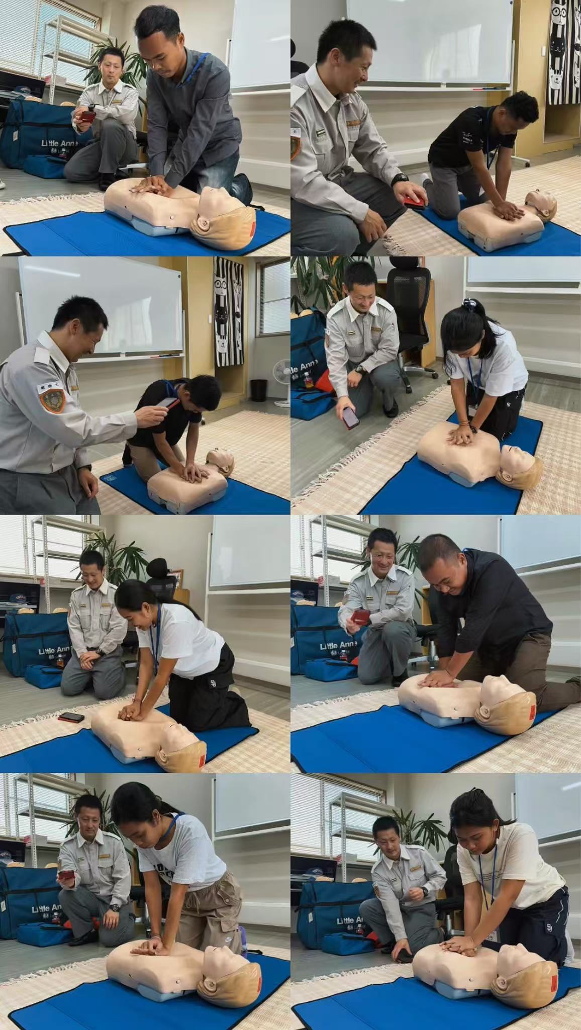 講師は消防署の担当者で、心肺蘇生法(CPR)やAEDの使い方、いざという時の対応について、実技を交えてわかりやすく教えていただきました。
